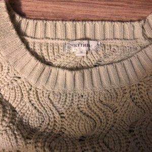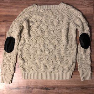 This Alythea beige/tan sweater has dark elbow patches. Not quite sure how to describe the material of these patches.