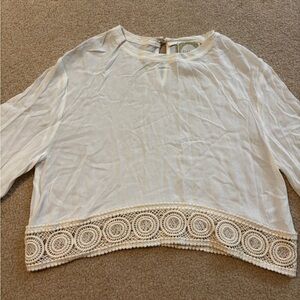 Chic blouse with intricate lace hem. Soft cream fabric. Ideal for casual elegance. Make me an offer!