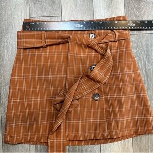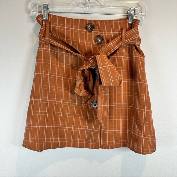 Alythea Plaid Orange Brown Button Down Mini A-Line Skirt Tie Front Belt Preppy