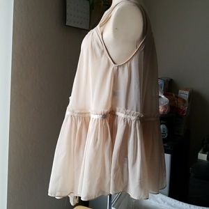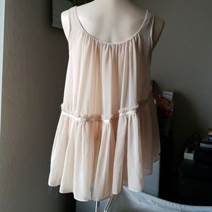 Gently-used, sheer and romantic, this chiffon top has that fun and flirty thing down pat. Round gathered neckline. Asymmetrical ruffle finished bottom.