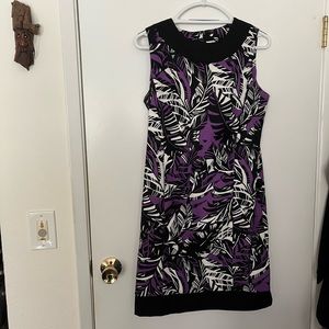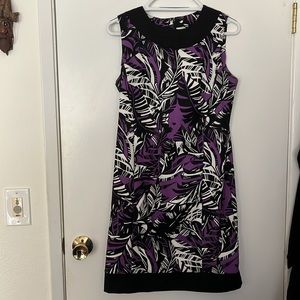 Stylish sleeveless dress with bold leaf pattern. Features black and purple colors. Perfect for any occasion.