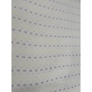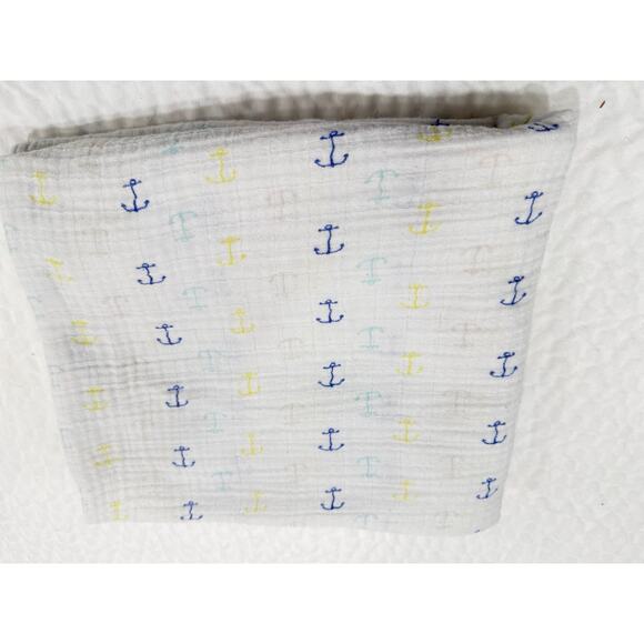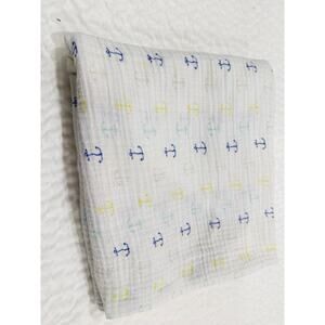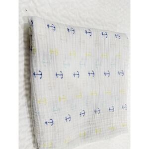 Soft muslin baby blanket in a nautical anchor print. White background with tiny blue, yellow and neutral anchors all over. Lightweight gauze texture that works as a swaddle, stroller cover or everyday cuddle blanket.