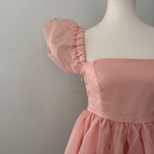 Chic pink dress with puff sleeves.