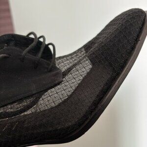 Beautiful Italian made 2" taper heeled Oxfords by Amalfi. Size 7-1/2 B. Black see-through mesh front, sides, and tongue ~ toe area hidden in black, with suede-like textile upper and covered heel, lace up with black waxed linen laces, soft leather interior, square toe, quality leather soles with minimal wear. Heel caps in excellent condition. Dressy. Stylish. Elegant. Unique. Vintage/Retro timeless design ~ dress them up with slacks, skirt, or dress.
