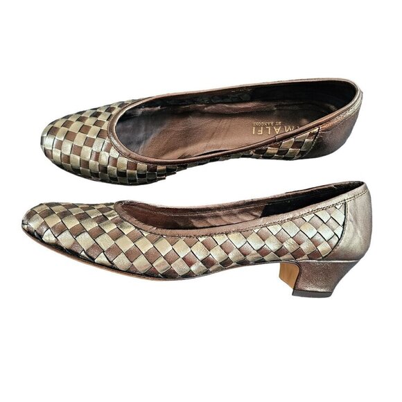 Elegant and versatile silver and bronze woven leather heels by Amalfi, offering comfort with a 1" kitten heel. Ideal for both formal and casual wear.