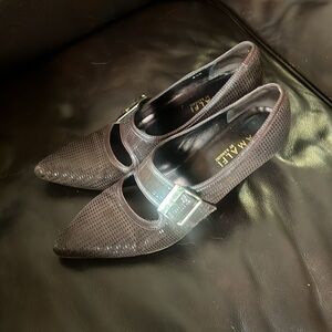 Almalfi by Rangoni ladies pumps. Very good condition brown and color brass color buckles on sides 8 1/2 narrow made in Italy 3 inch heels suede/leather.