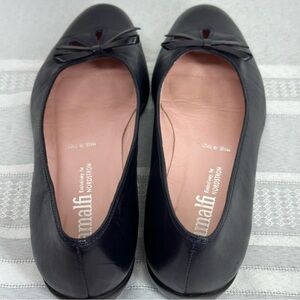Amalfi size 7 1/2 AA Narrow Navy Blue Leather Slip On Shoe Bow Loafer with 1 inches heel. In good preowned condition light wear to body some wear to footbed.