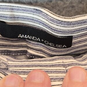 Elevate your wardrobe with these stylish Amanda & Chelsea pants in size 14. The white twill fabric with blue railroad stripes adds a touch of nautical and preppy vibe to your outfit. The pants feature a mid-rise waist, straight leg style, and ankle length, making them perfect for travel, casual outings, and business meetings.