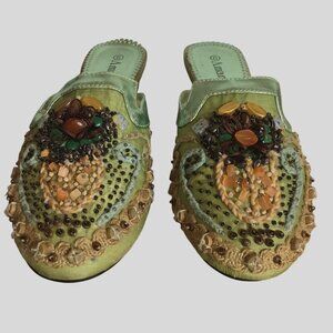 Amanda Moroccan Lights Green Beaded Mule Slides Embellished Satin Boho Size 9M