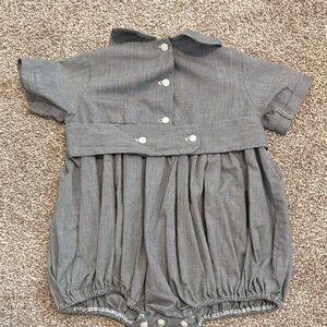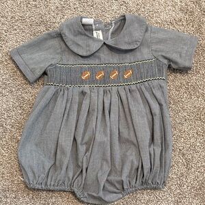 Adorable gray black and white checkered romper featuring cute football embroidery. Perfect for little sports fans.