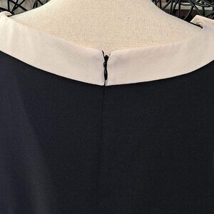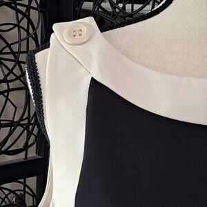 This elegant dress is black with cream accents around the armholes and the neckline. To the right of the round neck is a decorative button. Back zip.