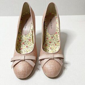 Amanda Smith Women's Belle High Heels Size 8M Pink Raffia Bow Straw Tweed Pumps 4"