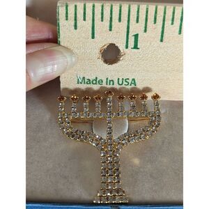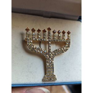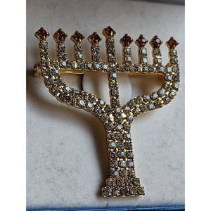 Lovely Rhinestone Menorra to wear next Hanukkah. Not a missing stone, no tarnish just waiting to be added to your collextion of holiday choices. I know it can be overstated, but really, they just don't make 'em like they used to! So go ahead and enjoy this quality. You won't be sorry!