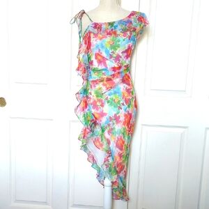 The Donatella dress is a chiffon midi with asymmetrical ruffle detail and tie strap. Asymmetrical design. Side zipper entry. Multi-layer lining.