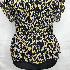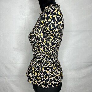 Amanda Uprichard Adrina Smocked Blouse Top Size Small Short-Sleeve Back-Zip, 100% polyester. This top is perfect dressed up or dressed down. It has a mock neck, smocked bodice with slight flare at the hem and flared statement short sleeves. It is a black, gold, pink and tan print.