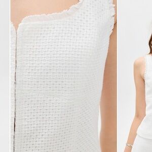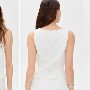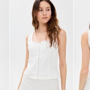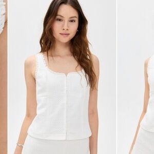 Elevated white tank with hook and eye closure down the front, square neckline with eyelet and lace detail.