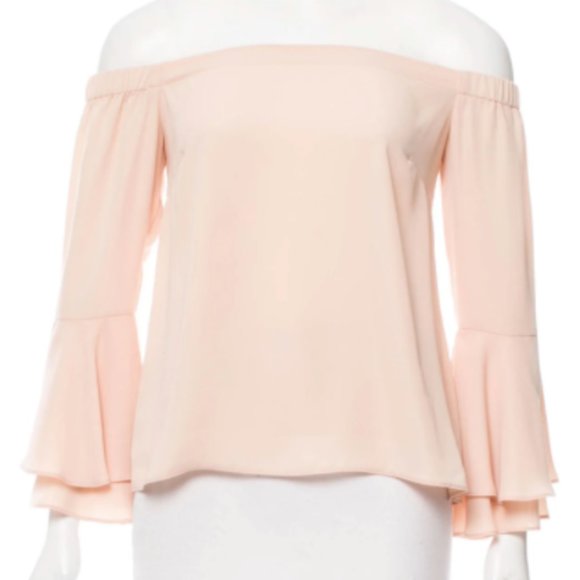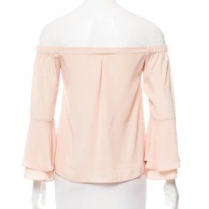 Ballet pink Amanda Uprichard Arabelle blouse with off-the-shoulder neckline, long bell sleeves and elasticized neckline. In NEW condition - no blemishes.