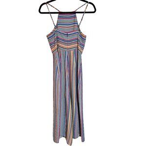 This sleeveless halter midi dress features vibrant multicolor stripes and adjustable spaghetti straps. The lightweight fabric ensures comfort and style.