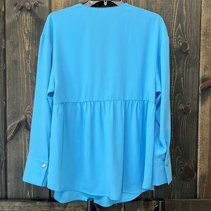 Amanda Uprichard brand blouse. Size large. Blue. Peasant look. Tie front. Babydoll like silhouette. Relaxed fit. Dress up or down. Long sleeves. Button hem. Slightly stretchy. Preloved. Please see all photos for condition.