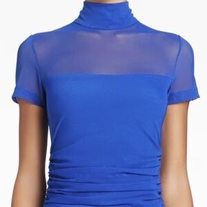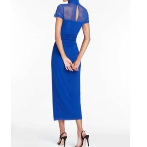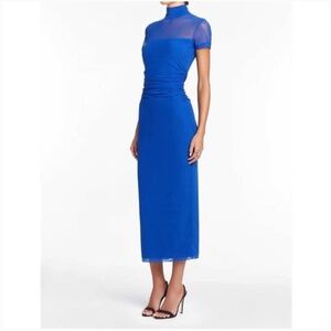 Elegant blue midi dress. High neckline. Short sleeves. Perfect for any occasion.