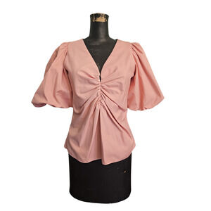 This Amanda Uprichard blouse features a flattering ruched front detail that enhances the silhouette, while the voluminous puff sleeves add a touch of drama and elegance. Crafted in a soft blush hue, it’s a perfect blend of sophistication and modern femininity for any occasion.