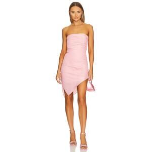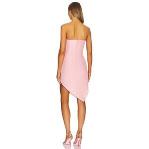 The Amanda Uprichard Emelia Strapless Dress in pink features a flattering ruched design that hugs the body, emphasizing the waist. Its asymmetrical hem adds a modern, dynamic touch, making it perfect for occasions where chic and contemporary style is key.