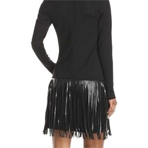 Black stretch knit dress with back zip closure and long strips of faux leather fringe at waist that hang down below hemline.