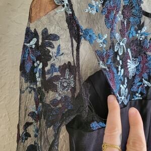 Illusion sleeves and yoke highlight the vivid floral embroidery of this little black romper by Amanda Uprichard that makes a lovely alternative at your next event.