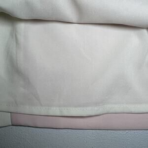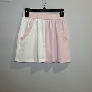Features: This skirt is characterized by its color block pattern (pink and ivory in this case), elastic waistband, and side slant pockets,