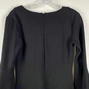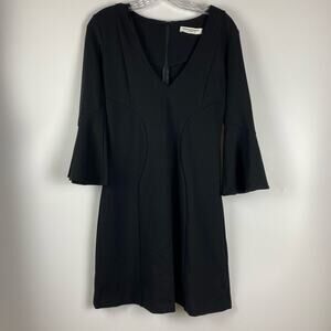 Amanda Uprichard Fresno dress in black crepe. Hourglass shape. 3/4 bell sleeves. V neckline. Hidden back zipper. The perfect little black dress. Size small. Excellent used condition. No flaws detected. Please check measurements provided for fit.
