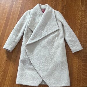 Hook-and-eye closures fasten the draped, crossover placket. On-seam pockets. Long sleeves. Lined. Fabric: Brushed, heavyweight suiting. Dry clean. Measurements: Length: 38” from shoulder; approx. 19” pit to pit