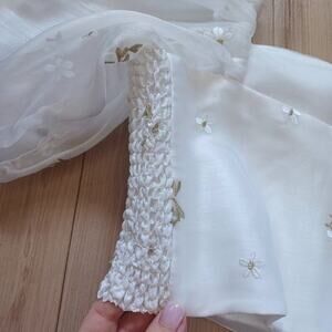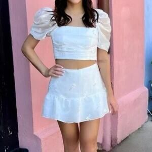 Amanda Uprichard Skirt Set in White/Ivory, a rare find perfect for bridal showers or photo shoots! Excellent used condition, worn once for my bridal photo shoot, dry-cleaned and ready to wear. Features white iridescent fabric with embroidered floral accents on lightweight woven polyester.