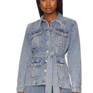 Amanda Uprichard Greyson Jacket in Blue in size small. Denim jacket is 100% cotton. Made in China. Machine wash. Front button closure. Front flap pockets. Detachable waist tie. Buttoned cuffs. So cute but just don't need it. With tags (never worn).