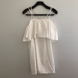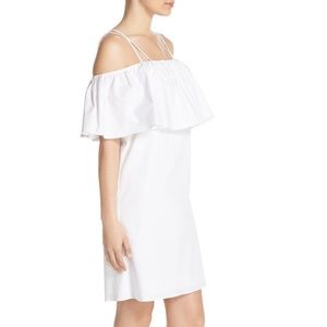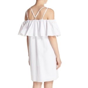 A fluttery white cotton dress balances alluring, shoulder-flaunting ruffles with a modest and comfortable silhouette. Delicate crisscrossing straps add a touch of edge to the romantic, ethereal look.
