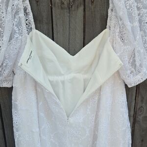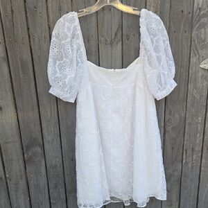 This elegant white lace dress features delicate puff sleeves and a flattering silhouette. Perfect for any occasion, it offers a timeless and sophisticated look.