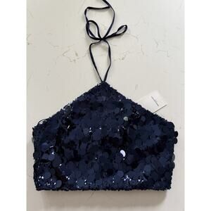The Amanda Uprichard Laurena Revolve Top in Ink Blue is a stylish and festive halter top perfect for a cocktail party or holiday gathering. Made from a blend of polyester and elastane, this sleeveless top features a zip closure and is adorned with sequins for added sparkle. The cropped style and halter neckline give it a trendy and chic look, while the vibrant blue color adds a pop of excitement to your outfit. Perfect for any season, this top is a versatile and fashionable choice for your next special occasion.