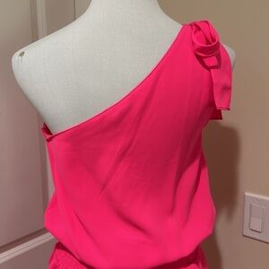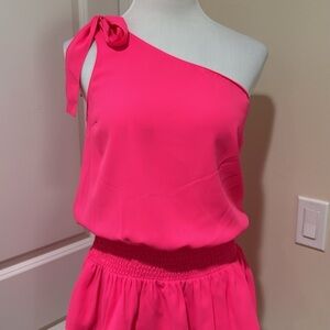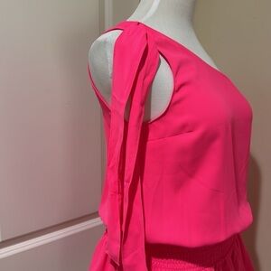 Amanda Uprichard Dress - Mckinley Style - Mini Length - One Shoulder with Tie - Cinched Waist with Ruffle Tiered Hem - Barbie Hot Pink Wash - Size Small - 100% Polyester - No Flaws - Excellent Used Condition!