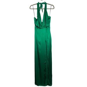 The Amanda Uprichard X Revolve Mezcal Silk Halter Gown in dark green exudes elegance with its luxurious silk fabric and sophisticated halter neckline.