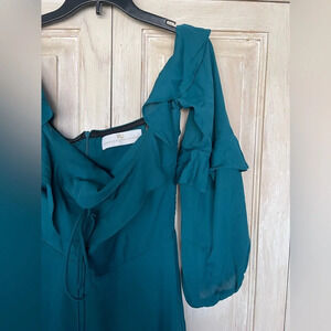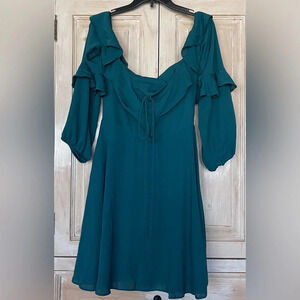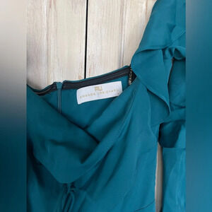 This stunning Amanda Uprichard dress features a deep teal color that is perfect for Christmas or any occasion. The dress has a flattering fit-and-flare silhouette with blouson sleeves. The neckline ties at the front for an adjustable fit, and the flowy fabric ensures comfort and style all day or night.