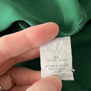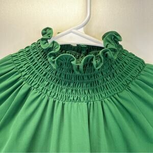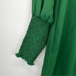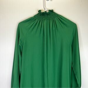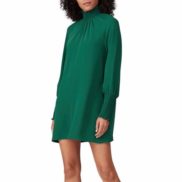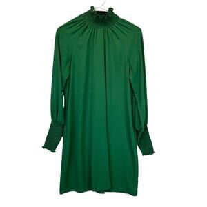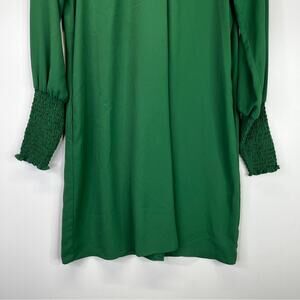 Amanda Uprichard Naoemi Shift Mini Dress in green. Crafted from vibrant green crepe, this long-sleeve shift dress features a ruffled high neckline and puff sleeves. Functional pockets add convenience making it a standout choice for any occasion.