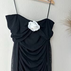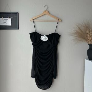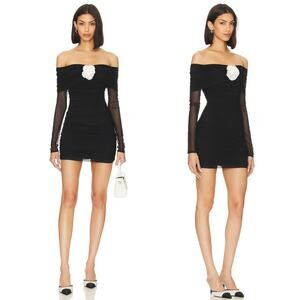 Amanda Uprichard Nellia Dress Black Ivory Rose Ruched Minidress. Chic black ruched mini dress with sheer long sleeves and white rosette detail at the bust. Perfect for parties, cocktails, or date night. Current style on Revolve. Size medium.
