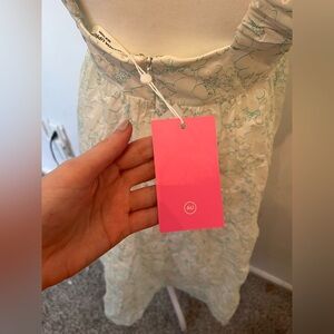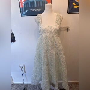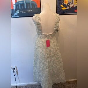 Amanda Uprichard Nicolia Midi Dress in the print Leona. New with tags, stunning green/white print. With a square neckline and ruched shoulder straps, this dress exudes sophistication and elegance. The tiered skirt and dual side seam pockets add a playful touch, while the center back zipper closure ensures a secure fit. Made with 100% cotton and lined with 100% polyester, this dress is comfortable and breathable, making it perfect for any occasion.