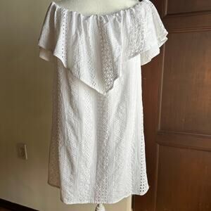 Amanda Uprichard Off Shoulder White Eyelet MiniDress - Sz. S - Crisp white eyelet straight sheath mini dress with a delicate ruffle neckline that can be worn on or off shoulder. Perfect for a bridal shower or bachelorette party