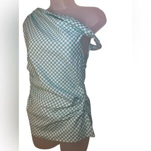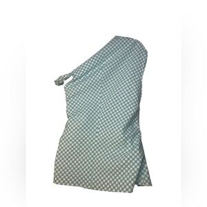 Keywords: Amanda Uprichard blouse, gingham blouse, one shoulder top, green and white print, sleeveless blouse, sample sale item, trendy women's top, boutique style, lightweight blouse, minimalist fashion, Amanda Uprichard Small