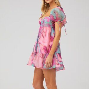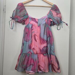Vibrant mini dress with puff sleeves. Features a pink and blue swirl pattern. Perfect for a stylish look.
