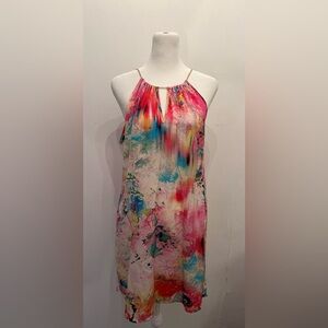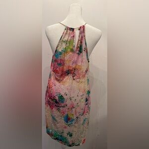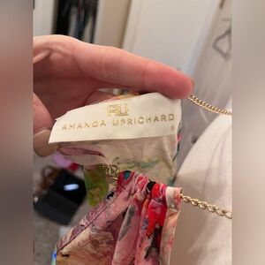 Size S Amanda Uprichard Print Dress. Print is a lovely multicolor dress with chain straps, perfect for a summer event. Definitely a mini swing dress. There's something that could be a stain on the upper lefthand part of the dress but it honestly looks like part of the print so I'm not convinced it's a stain!