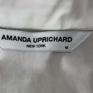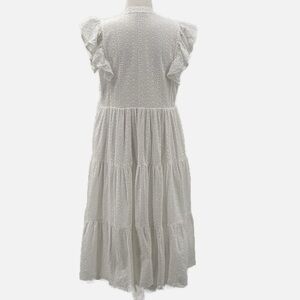 Amanda Uprichard Sheradin Tiered Eyelet Dress in White - Size Medium. Good pre-owned condition. The lining hangs a little longer than the eyelet part in some spots. My guess is it was washed instead of dry cleaned. You may be able to get a dry cleaner to press out the eyelet part to restore it. Or you could having the lining cut off a bit. Still looks really cute and it's full on the bottom so not too noticeable. Excellent condition other than that. Body is 100% cotton and the lining is polyester and elastane. Fully lined, side seam pockets, tiered ruffled skirt, split neck, flutter sleeves. Approximate measurements: 18" pit to pit, 17" empire waist, 41 1/2" length from shoulder seam. Measurements taken laying flat. Knee length on me and I'm 5'5".