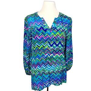 Amanda Uprichard Silk Chevron Pint Long Sleeve Tunic Blouse Top Blue Green Large