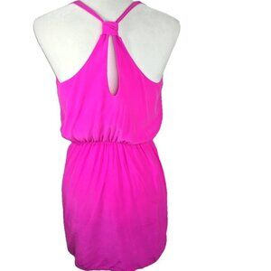 Perfect summer mini dress. V neck. 100% silk. Neón pink. Cinch at waist with adjustable tie.