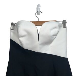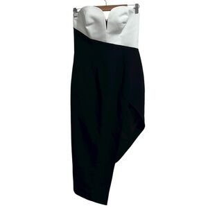 Amanda Uprichard Soiree Strapless Asymmetrical Midi Dress In Black & Ivory is such a stunning piece! This sweetheart neckline dress features a wired bodice V-wire bust. Crepe fabric with high seam split and asymmetrical hem. Back zip closure. 100% polyester